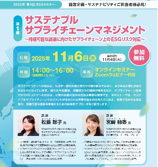 日経印刷株式会社主催のESGオンラインセミナー:「サステナブルサプライチェーンマネジメント~持続可能な調達に向けたサプライチェーン上の ESGリスク対応~」を11月6日に開催いたします。